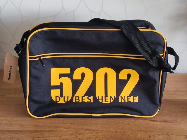 Retro Shoulder Bag in schwarz mit gelber Schrift.